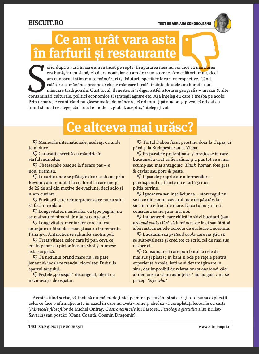 E un text al Adrianei Sohodoleanu în Șapte Seri cu care achiesez. Îmi place mâncarea și mi se pare din ce în ce mai greu de găsit, între prețuri astronomice și decoruri de Instagram.